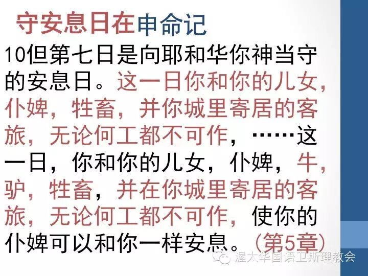在这里更是直接指出,目的是使你的仆婢可以一样安息。不至于以色列人停工,确认仆婢为他们工作,而是一同享受神所赐的休息。