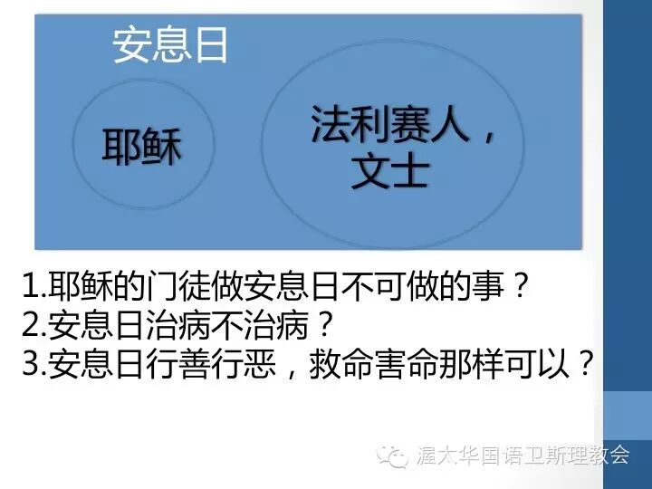 耶稣提到,人子是安息日的主。是再宣告,藉着律法、规条想要进入神的安息之中,而耶稣是那位在操练安息日之时所要记在心上的那位主。