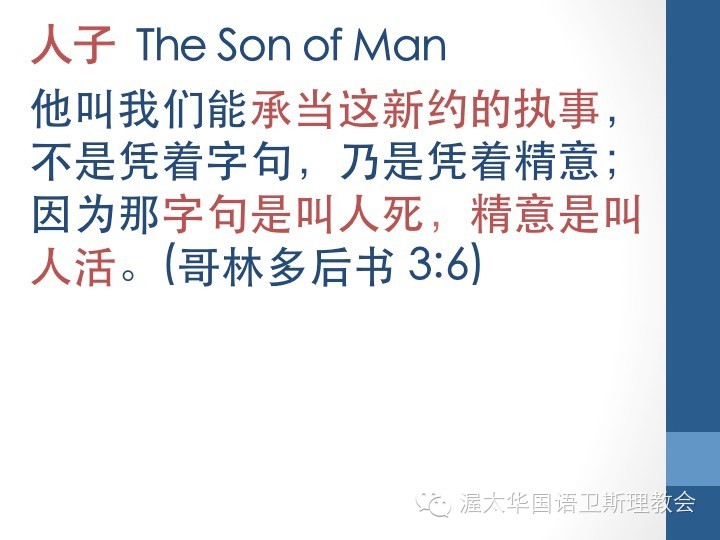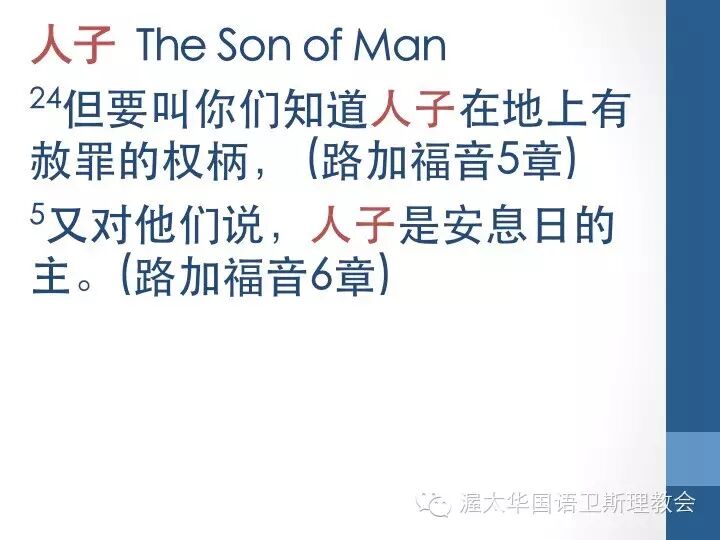 我们再接着看在这里提到一个词“人子”。这个词在福音书中出现90次,在路加福音出现就有26次之多。其中除了12:34节之外,均是耶稣自称,可以译为“人的儿子”。在但以理书7章13-14节中的用法,我们就明白,人子指的是弥赛亚;同时也就是神以人的形象来到世间,那样的一位。