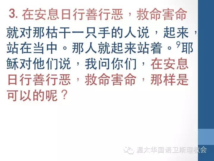 另外一个安息日,耶稣在会堂里遇到一个右手枯干的人。我们可以推测,这个人可能是肌肉萎缩了。文士和法利赛人也同样在会堂中,这次他们来的做什么?——窥探耶稣在安息日治病不治病!目的呢?——得把柄告耶稣。正如在第五章所提到的,耶稣知道人的心怀意念。