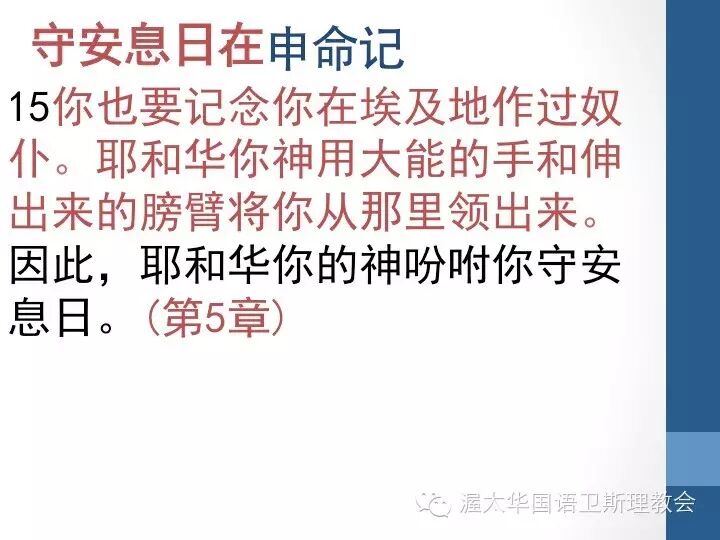 只是在申命记中,所面对的听众是更深的经历神,知道他们是“神用大能的手从埃及地领出来的百姓”。因此在这里,提到守安息日的原因和出埃及记是不相同的。