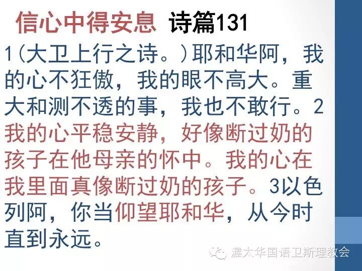 我们知道,我们在世上的每一天,要经历的状态不仅仅是用尽所有的去爱神爱人,更要放一百个心。这是信心,我们信心的成长,到达小孩子的样子,或者在一方面来说,就是要向婴孩一样平静安稳。这种安稳是我吃过奶了,我就休息了。我会担心我下一顿有没有吗?我会担心计划能不能达成吗?不用了。将你所谋,所求的交托耶和华。这不是懒人,不谋也不求,在尽力做好自己的部分之后,交托在神的手中,依靠神来坚立我们所做的工。那我们就能够正在的经历安息,这种安息不是因着行为,行律法而来的,而是在基督里得蒙神的赦免而获得的;这种安息不是每天提心吊胆的记着什么能做什么不能做,而是以爱神爱人为衡量,充满自由的去活出我们里面基督徒的新生活;这种安息不是靠着我们能做到的,是交托给神,在凡事上经历神的安息。