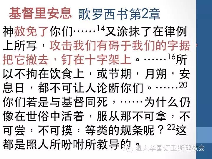 歌罗西的教会中也有犹太人,作者提到过去的规条,律法,有碍于我们的字句都被撤去,当我们还会犯十诫,如“贪恋别人的东西时”,来到神面前悔改,我们知道神怜悯,也赦免我们。我们不再被规条束缚。在耶稣里,罪远离我们,叫我们有安息。