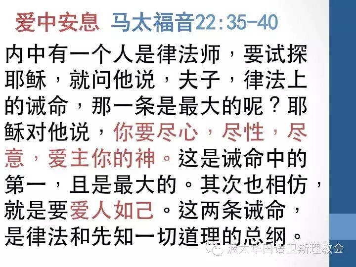 即是爱神,爱人的命令。第一是爱神,用尽你一起所能的去爱神,如果这样做,也就是爱人如己。这两个是不冲突的。而两个也就是“律法和先知一切道理的总纲”,也就是“字句”后面的精意。我们在做决定时,不用再去翻旧约,神是怎么规定的?哪些是可以做哪些是不可以做的?当我们一想,这是爱神吗?这是对人有益处吗?我们就知道是否要做,及怎么去做。