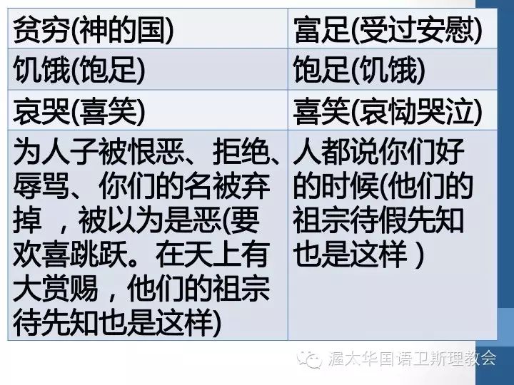 - 路加福音,每一个有福的群体对应的也有一个有祸的群体,在马太福音中所涉及的多为“有福”的主题。